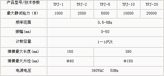 產(chǎn)品概述: TPJ系列機械式彈簧疲勞試驗機主要應(yīng)用于拉伸、壓縮螺旋彈簧的疲勞壽命試驗 功能特點: 振幅、頻率可調(diào);振動次數(shù)及頻率數(shù)字顯示; 預(yù)置試驗次數(shù)自動停機;可做單對或多對彈簧的試驗機; 操作簡單、運行可靠。 技術(shù)參數(shù):