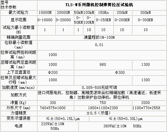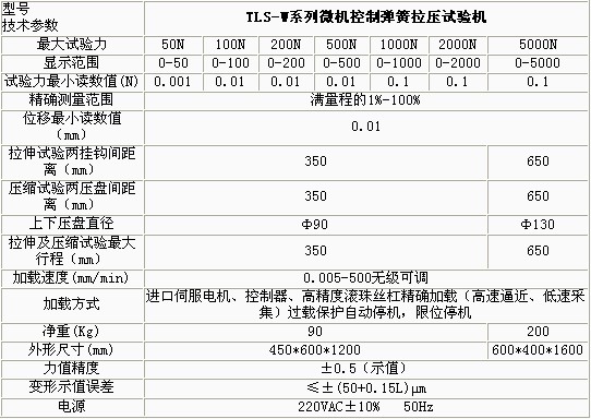 產(chǎn)品概述: TLS-WI系列微機控制拉壓彈簧試驗機依據(jù)JB/T7796-2005《拉壓彈簧試驗機技術條件》規(guī)定的技術要求制成。該型拉壓彈簧試驗機主要用 于測試各種螺旋彈簧及彈性元件的強度,空氣彈簧試驗機廠家,即在一定的變形量(或高度)下測試彈簧的試驗力或在一定的試驗力下測定彈簧的高度或變形量。 功能特點: 本機主要適用于各種彈簧的強度試驗、力學性能及工序能力分析。 本機軟件包有速度控制、參數(shù)輸入、數(shù)據(jù)處理、結果觀察、圖表顯示、圖表打印、數(shù)據(jù)保存等功能模塊組成。 試驗方式多樣化,可以設置彈簧的試驗力,檢測彈簧的剩余高度或變形量;也可以設置彈簧的剩余高度或變形量,檢測試驗力等功能。 多點自動變速采集數(shù)據(jù),并自動返回到初始位置,氣彈簧試驗機,整個試驗過程自動化。 過載自動返回,以保護傳感器不受損壞。 具有強大的數(shù)據(jù)處理及數(shù)據(jù)統(tǒng)計功能,繪制剛度曲線、計算彈簧的分段剛度,彈簧扭力試驗機,可以進行數(shù)據(jù)統(tǒng)計,繪制正態(tài)分布圖、計算工序能力指數(shù)。采用數(shù)控電機調速系 統(tǒng)或進口交流伺服電機及調速器和精密滾珠絲杠副組成傳動系統(tǒng),與高精度負荷傳感器、位移傳感器及數(shù)字式數(shù)據(jù)采集卡、PC組成測控系統(tǒng),實現(xiàn)了穩(wěn)定可靠運行 及精確測量。 技術參數(shù): ![]() ![]()